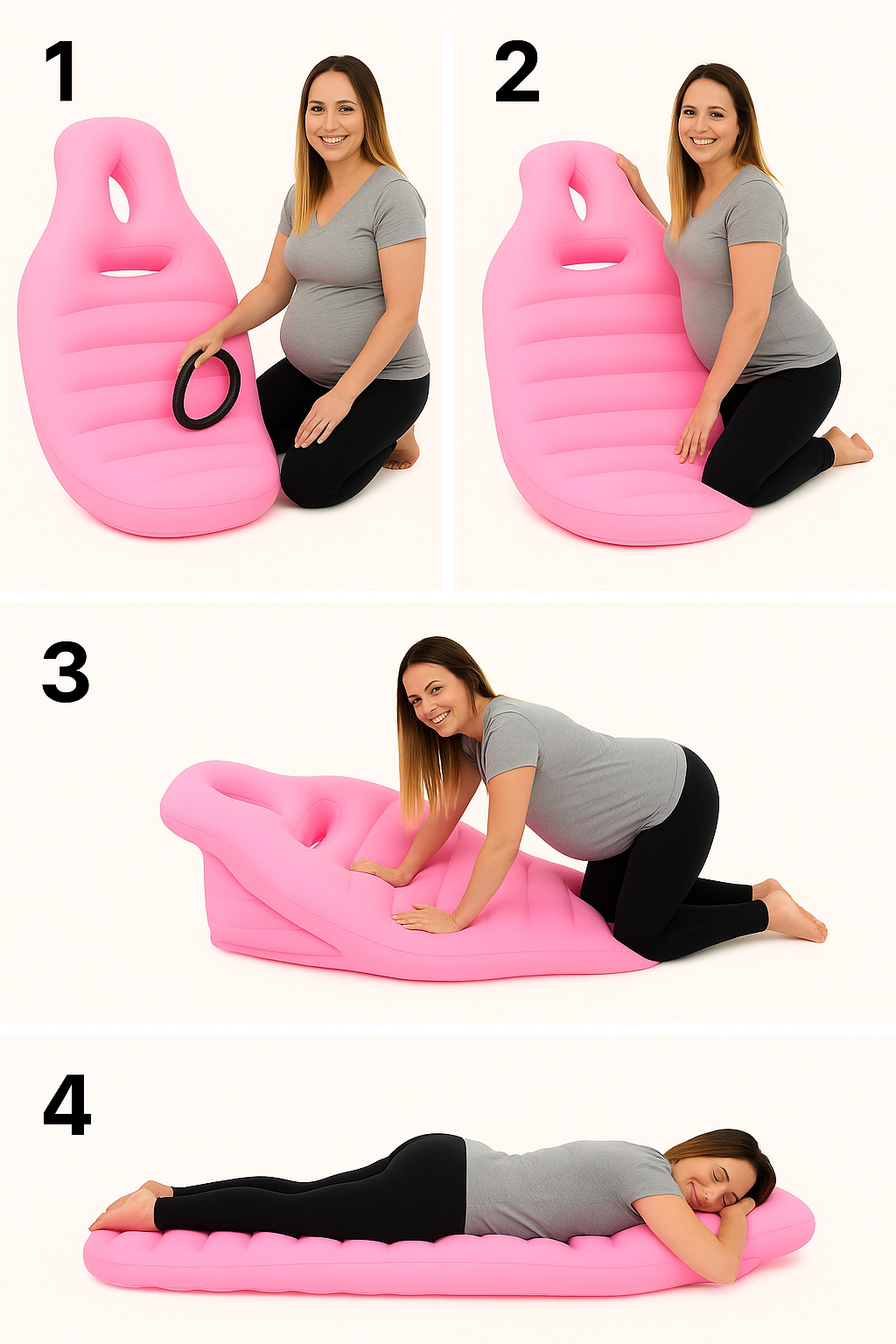 Simply inflate the pillow to your desired firmness and position it on any flat surface. Use the specially designed opening to comfortably accommodate the baby bump, allowing for pressure relief and enhanced relaxation.
