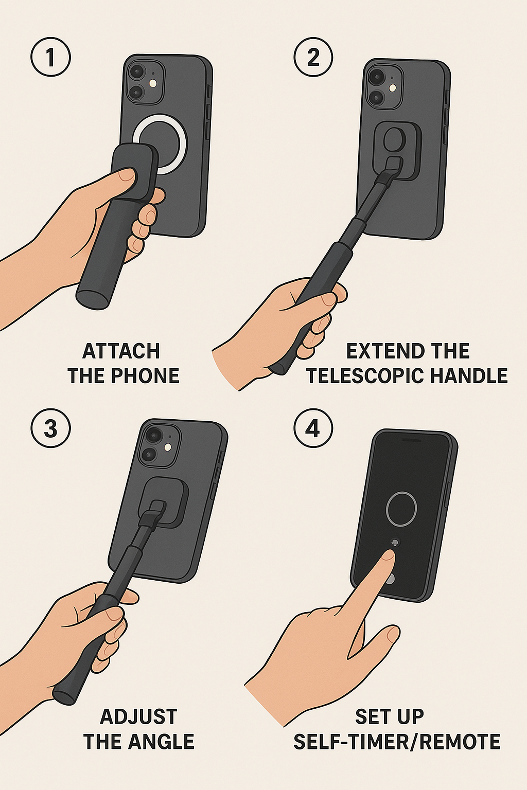 Simply attach the SnapGrip™ to your MagSafe-compatible phone or case, then extend the telescopic handle to your desired length. Use the built-in self-timer and grip handle to stabilize your phone and capture perfect shots or steady videos effortlessly.